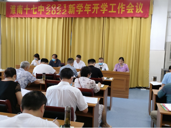 8月31日上午,淮南第十七中学2021——2022学年第一学期全体教职工大会在一楼教科研活动室召开。全体教职工参加会议。校支部书记、校长代多对,工会主席张千贵、教务处主任李传喜就新学期党建、教学教研、防疫及校务管理做了部署安排。会议由校办公室主任李立素同志主持。