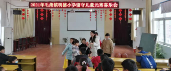 今天,对于毛集镇明德小学的留守儿童来说,是充满爱的一天。虽然他们不能与远在外地的父母一起过上元宵节,但是在我校组织下,我校领导及老师们带着孩子们边玩游戏,边猜灯谜,边吃元宵,过了一个特殊的“元宵喜乐会”。