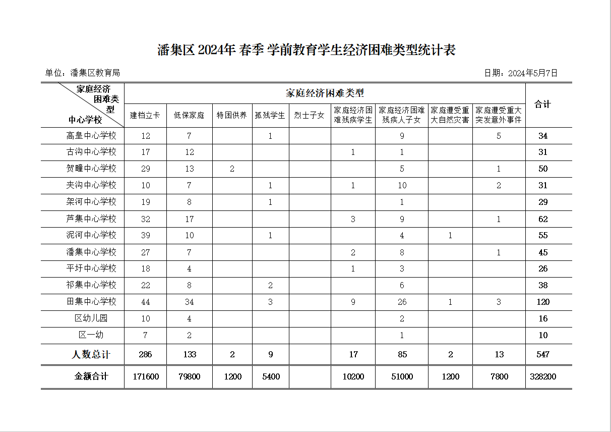 【工作进展】潘集区2024年春季学期学前教育资助情况统计表