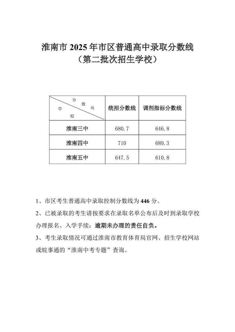 【录取分数线】淮南市2025年市区普通高中录取分数线(第二批次)