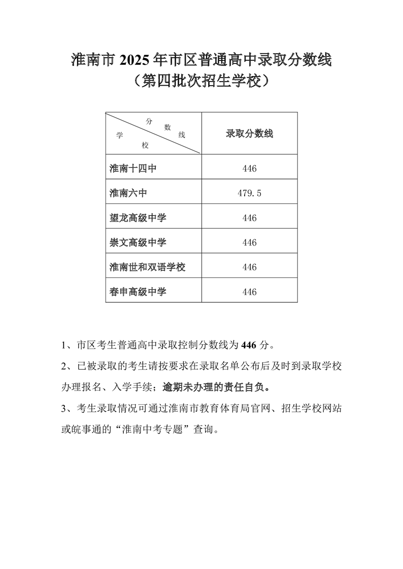【录取分数线】淮南市2025年市区普通高中录取分数线(第四批次招生学校)