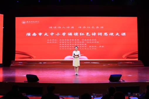 为深入学习贯彻习近平总书记对学校思政课建设的重要指示精神,推进大中小学思想政治教育一体化建设,12月3日下午,淮南市教育体育局、淮南师范学院联合主办的“淮南市大中小学诵读红色诗词思政大课”在淮南师范学院信息技术楼学术报告厅成功举办。在淮6所高校及部分大中小学思政课一体化共同体成员学校的12支代表队齐聚一堂,以声传情,以诗明志,共同呈现了一场精彩纷呈的红色诗词文化盛宴。