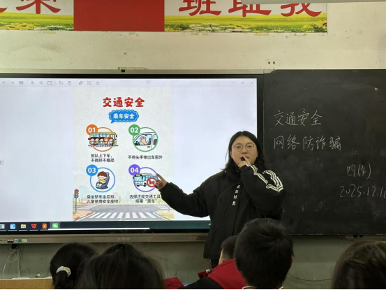 冬季交通安全板块:班主任结合冬季雨雪、雾天多、天黑早的特点,通过短视频展示校门口、上下学路段的典型安全隐患,带领学生分析“过马路不闯红灯”“不在路边追逐打闹”“乘坐正规车辆”等要点;还设置“安全小剧场”,让学生扮演“行人”“司机”,模拟上下学途中可能遇到的突发情况(如路面结冰、车辆盲区),在实践中掌握避险技巧。
