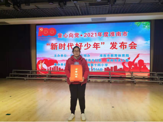 11月24日下午,由市文明办、市教体局、团市委、市妇联、市关工委主办,淮师附小山南第十四小学承办的童心向党·2021年度淮南市“新时代好少年”发布会在十四小报告厅举行。此次发布会旨在通过宣传和展示“新时代好少年”的先进事迹,在广大未成年人中营造积极学习新时代好少年,人人争当时代新人的浓厚氛围。淮南特校培智八年级李欣冉荣获“新时代好少年”的称号并现场接受表彰 。