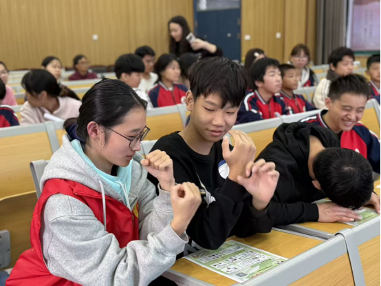 活动的最后环节,志愿者们走进学生中间,耐心指导大家找准眼保健操的穴位,规范按压手法、力度与节奏。他们一遍遍示范,逐一纠正动作,确保每位学生都能掌握这套缓解视疲劳、预防近视的有效方法。志愿者们通过充满温度的交流,引导学生们深刻认识到爱眼护眼的重要性。现场气氛热烈,掌声与笑声此起彼伏,洋溢着温暖与活力。